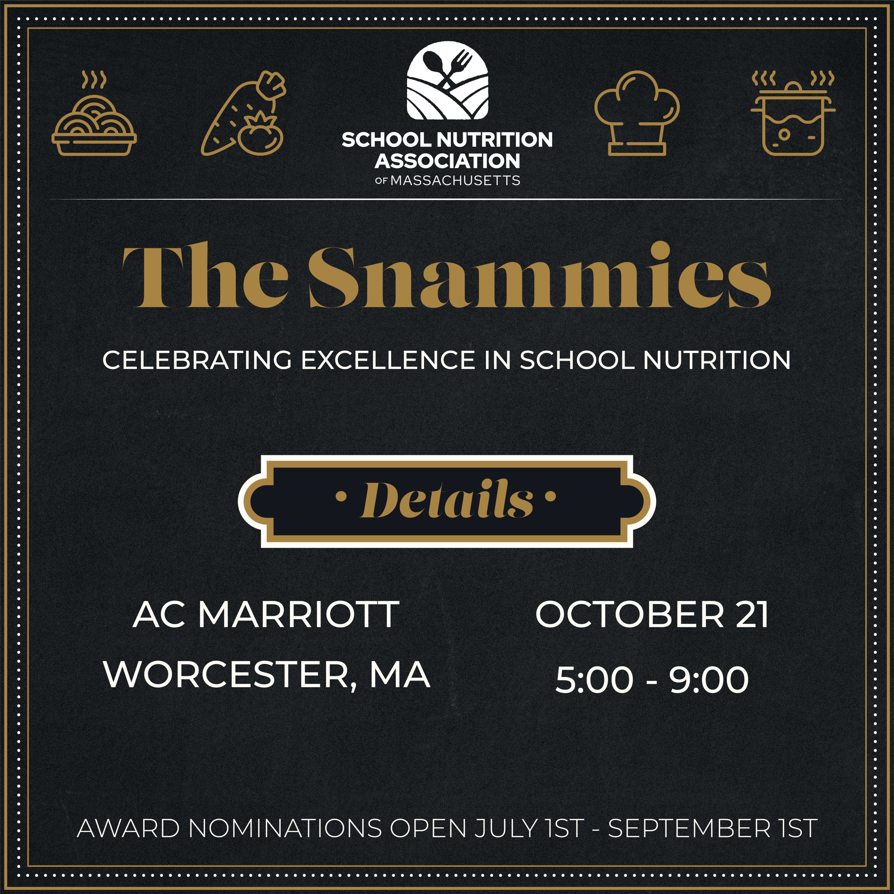 Kick-off the SNA of Mass Annual Fall Conference and Food Show with a reception & inaugural "SNAMMIES" Awards Program! Celebrate an evening of excellence in school nutrition with SNA of Mass!